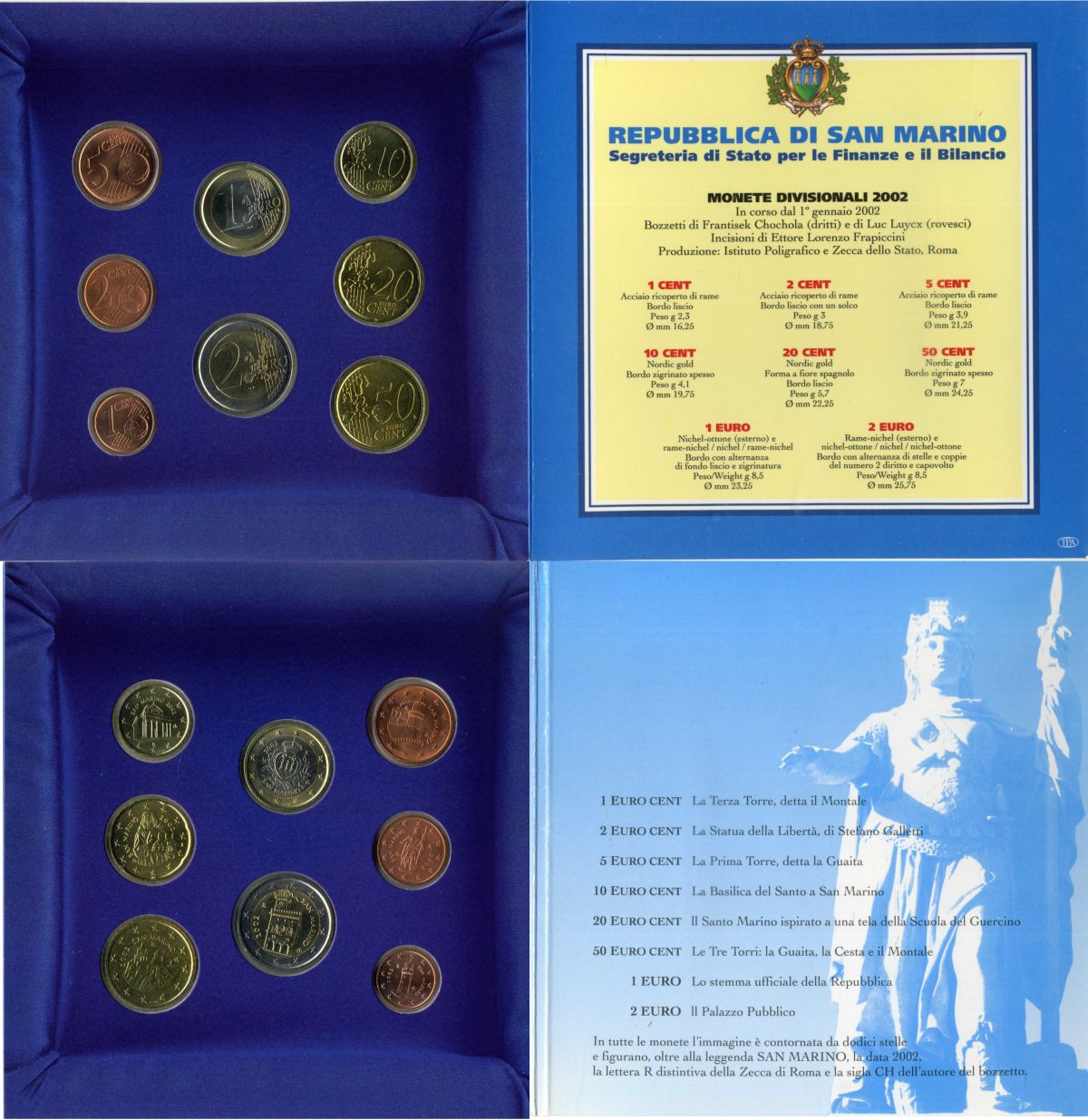 Сан-Марино евронабор из 8 монет (1, 2, 5, 10, 20 и 50 евроцентов; 1 и 2 евро) 2002 первый год выпуска, в оригинальной упаковке KM 440, 441, 442, 443, 444, 445, 446, 447 сталь плакированная медью, нордик и биметалл UNC 7-4-1-51