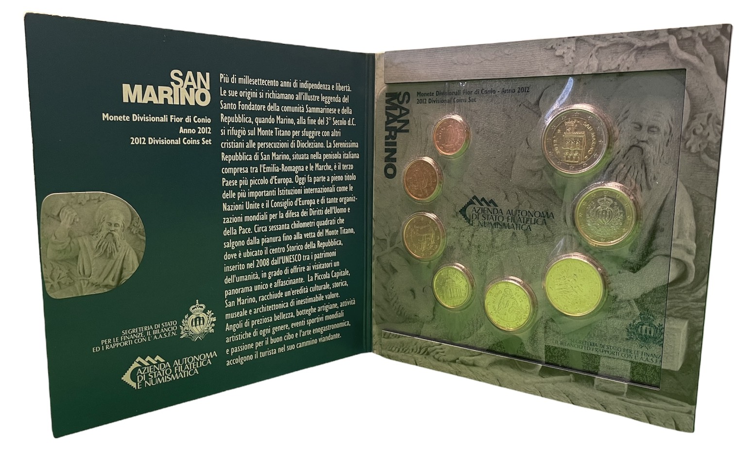 Сан-Марино евронабор из 8 монет 2012 1, 2, 5, 10, 20, 50 евроцентов, 1, 2 евро, пластик, запайка, буклет BUNC 4-5-3-21