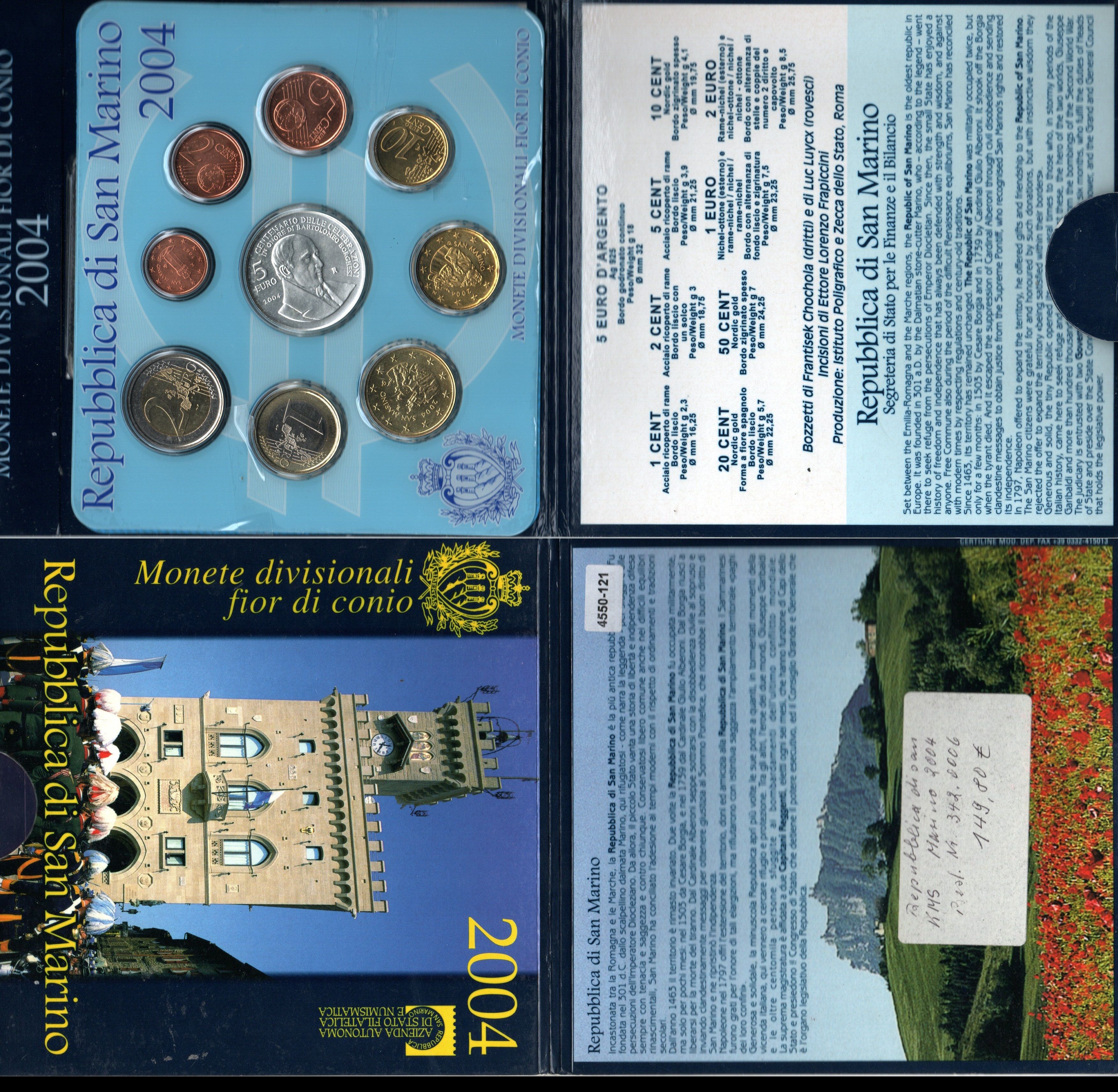 Сан-Марино годовой набор из 9 монет (1, 2, 5, 10, 20 и 50 евроцентов; 1, 2 и 5 евро) 2004 в оригинальном буклете, тираж 70.000 экземпляров KM MS64 (440, 441, 442, 443, 444, 445, 446, 447 и 458) BU 8-2-01-35