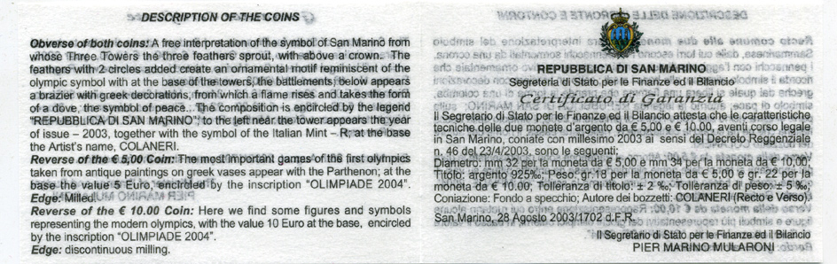 Сан-Марино набор 5 и 10 евро 2003 Олимпийские игры в Афинах 2004, виды спорта, в оригинальной коробке, с сертификатом KM 453, 454 серебро PROOF 7-1-64