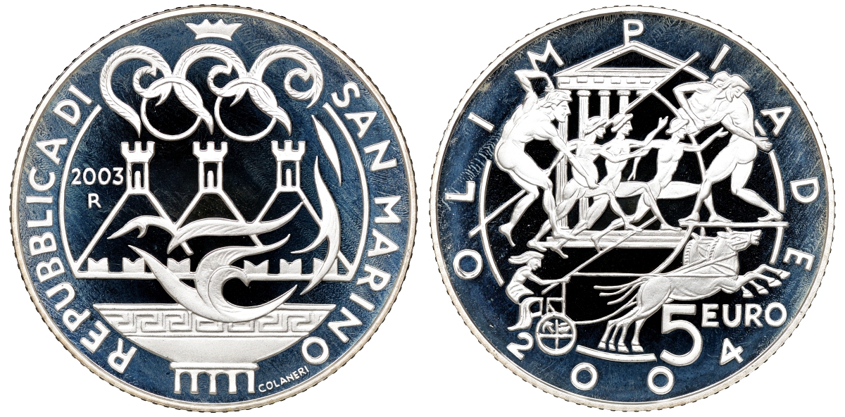 Сан-Марино набор 5 и 10 евро 2003 Олимпийские игры в Афинах 2004, виды спорта, в оригинальной коробке, с сертификатом KM 453, 454 серебро PROOF 6-5-1-02