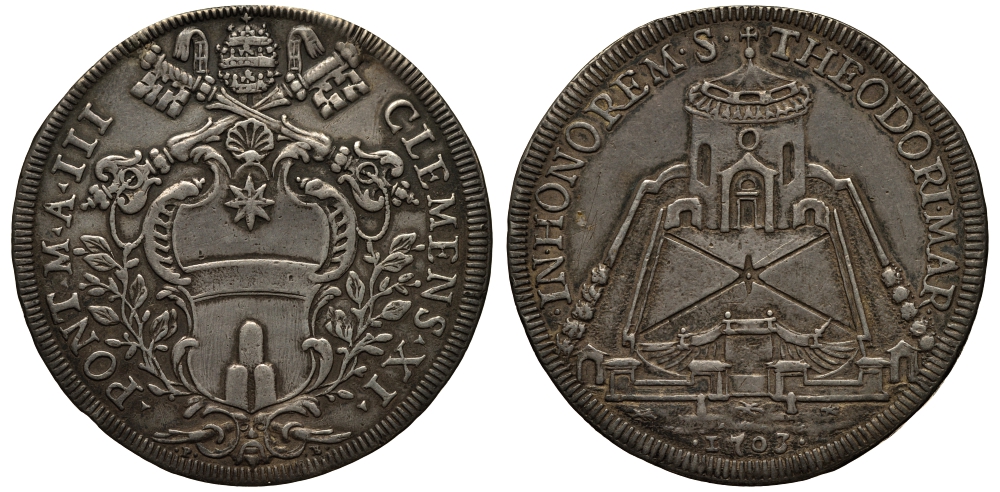 Ватикан 1 пиастр 1703 Климент XI. Базилика Святого Теодора на Палатине Dav. 1431, Muntoni 40 серебро 10-005-31