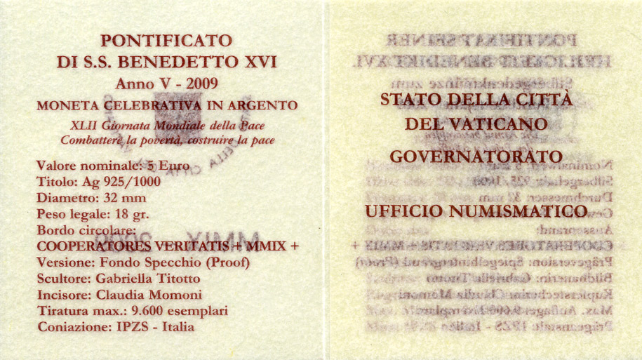 Ватикан 5 евро 2009 Бенедикт XVI, Международный год мира, в оригинальной коробке с сертификатом KM 415 серебро PROOF 7-1-1-27