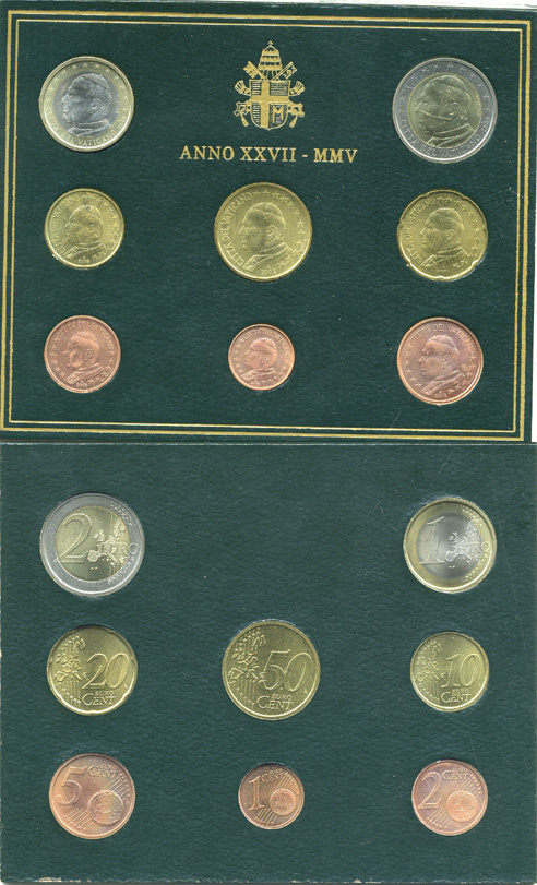 Ватикан евронабор из 8 монет 2005 Папа Иоанн Павел II, в оригинальном буклете KM MS 111 биметалл UNC 5-6-2-68