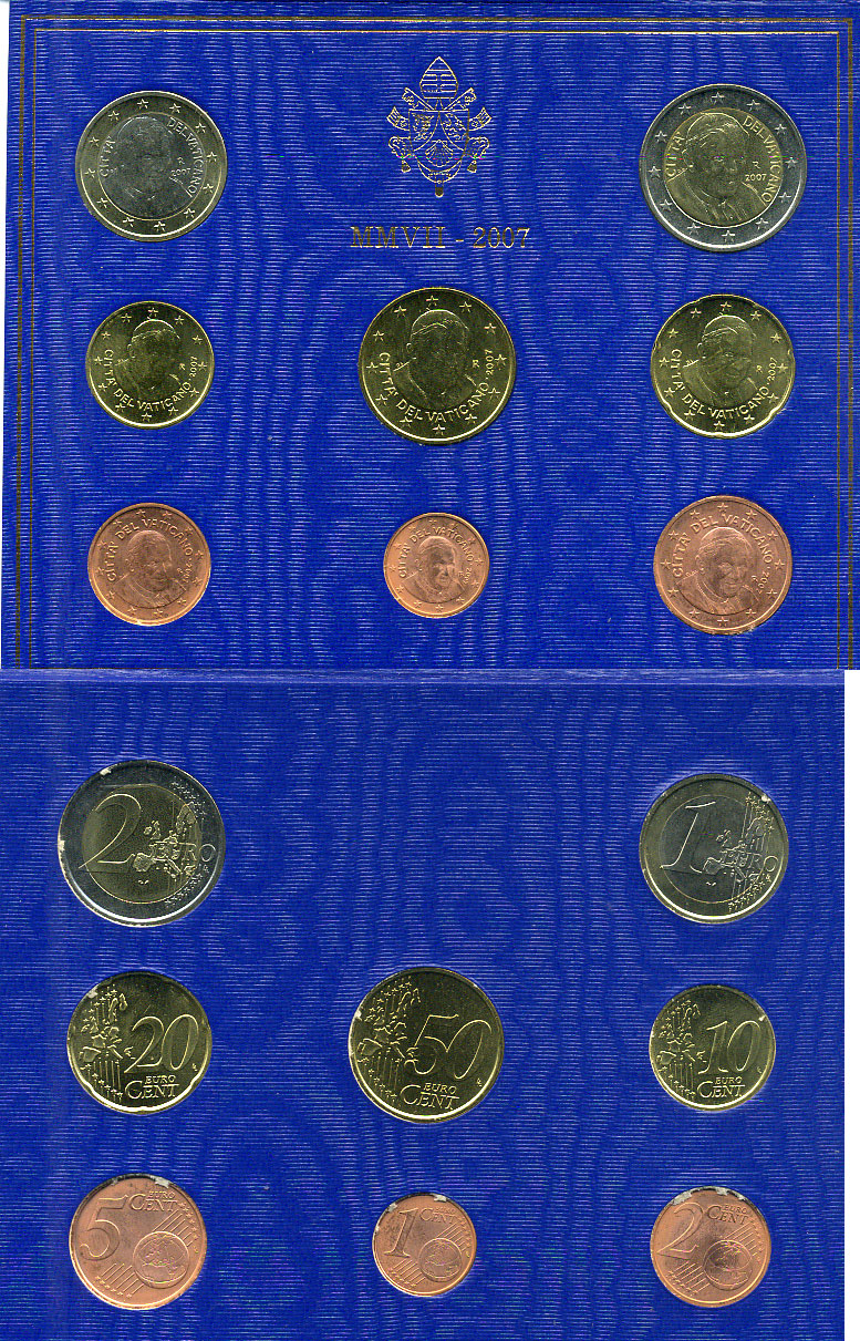 Ватикан евронабор из 8 монет 2007 Бенедикт XVI, в оригинальном буклете биметалл KM MS 114 UNC 1-4-4-03
