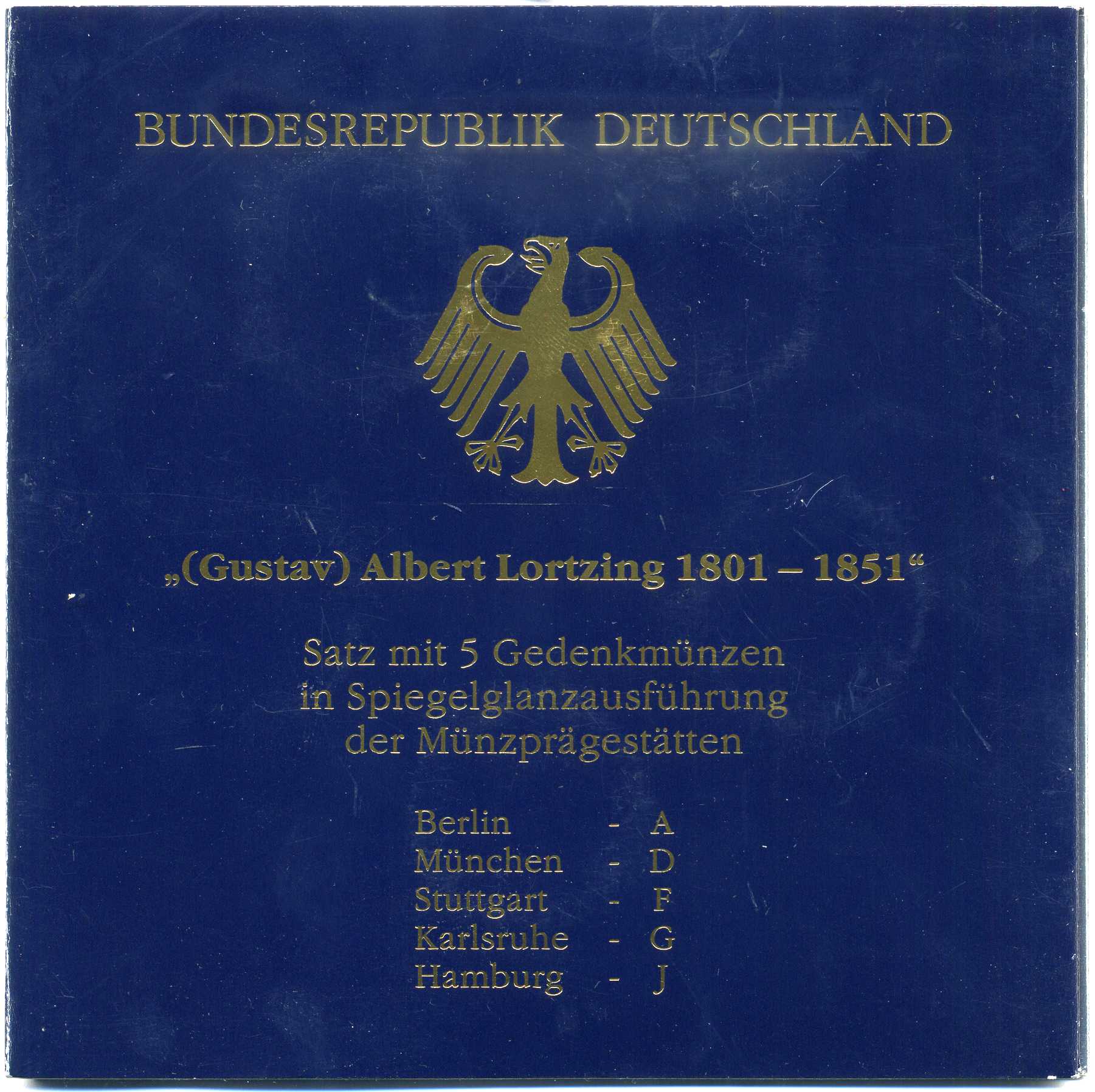 ФРГ набор из 5 штук по 10 марок 2001 A, D, F, G, J, 200 лет со дня рождения Альберта Лорцинга KM 205 серебро PROOF 6-5-2-13