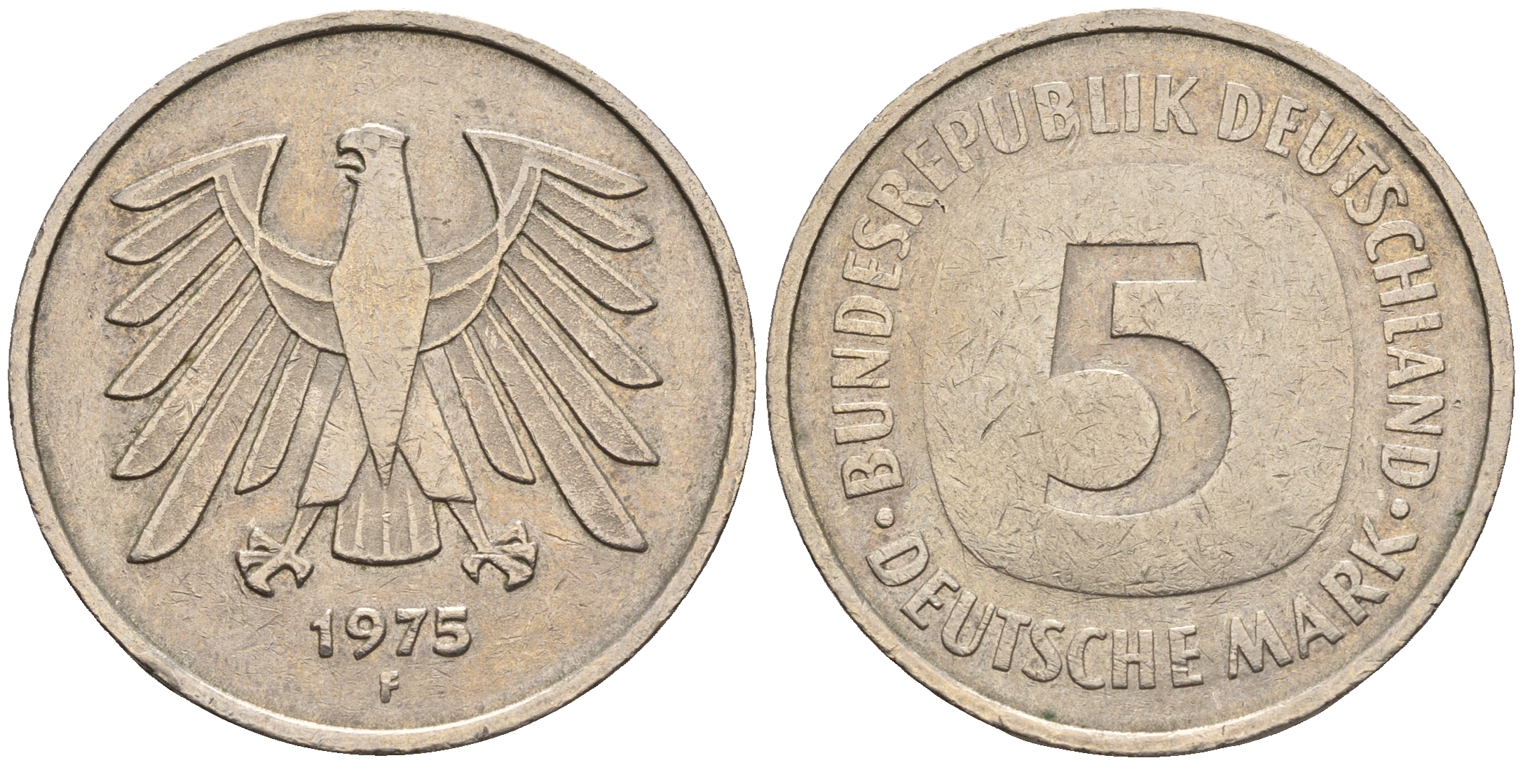 ФРГ 5 марок 1975 F, монетный двор Штутгарт КМ 140.1, J. 415 медно-никель плакированный никелем 85-1146
