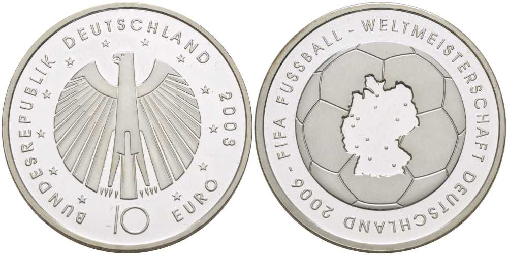 ФРГ 10 евро 2003 чемпионат мира по футболу 2006 года в Германии, первая монета KM 223, DE.S. 10.8 серебро PROOF 02-251-51
