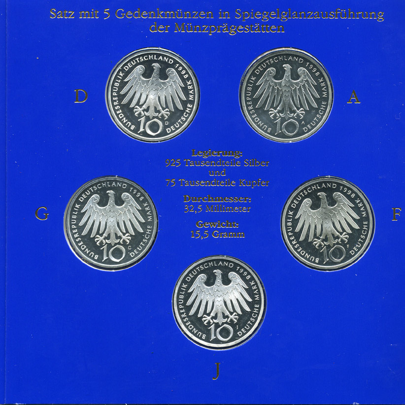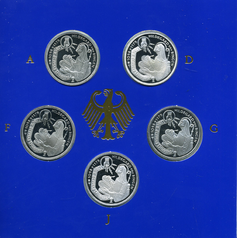 ----ФРГ набор из 5 штук по 10 марок 1998 A, D, F, G, J, 900 лет со дня рождения Хильдегарда Бингенская KM 193 серебро PROOF 6-5-2-2