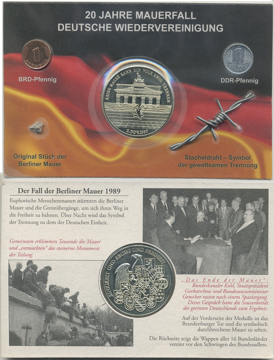 ГЕРМАНИЯ НАБОР ИЗ 2 МОНЕТ И МЕДАЛИ 2009 ОРИГИНАЛЬНЫЙ НАБОР В КАРТОННОМ БУКЛЕТЕ ПОСВЯЩЕННЫЙ 20- ЛЕТИЮ СНОСА БЕРЛИНСКОЙ СТЕНЫ, И НАРОДНОМУ ЕДИНСТВУ, СОДЕРЖИТ 1 ПФЕННИГ ФРГ И 1 ПФЕННИГ ГДР, ЖЕТОН 9 НОЯБРЯ 1989 ГОДА СО СНЕСЁННОЙ БЕРЛИНСКОЙ СТЕНОЙ НА ФОНЕ БРАН