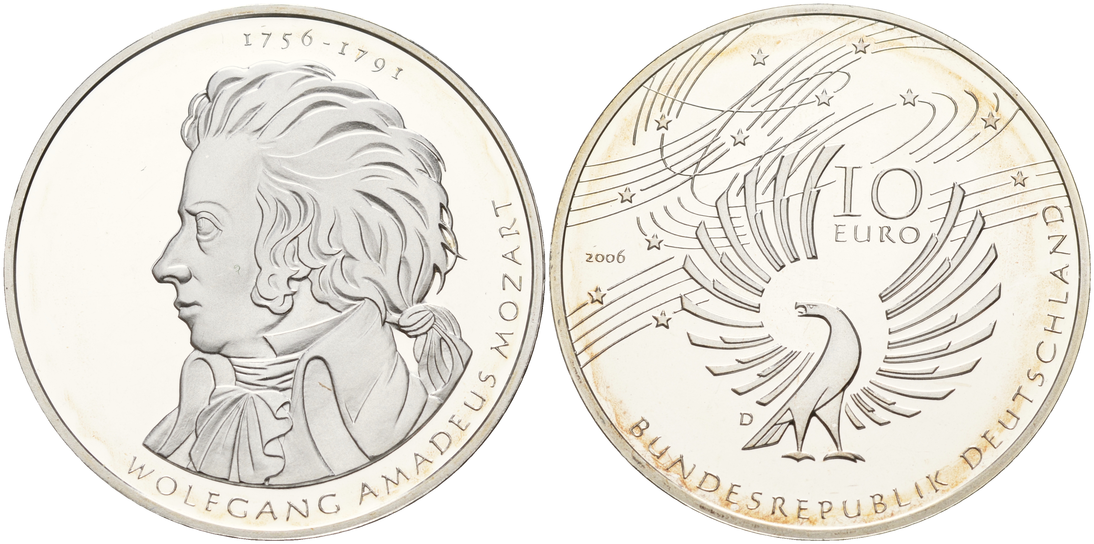 ФРГ 10 евро 2006 D, 250 лет со дня рождения Вольфганга Амадея Моцарта KM 248, DE.S. 10.29 серебро PROOF 11-183-21