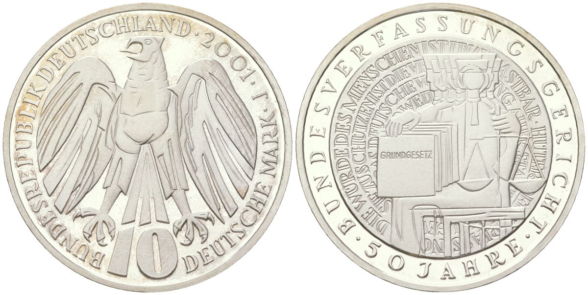 ФРГ 10 марок 2001 J, 50 лет Федеральному конституционному суду KM 206 серебро PROOF 1530-1233