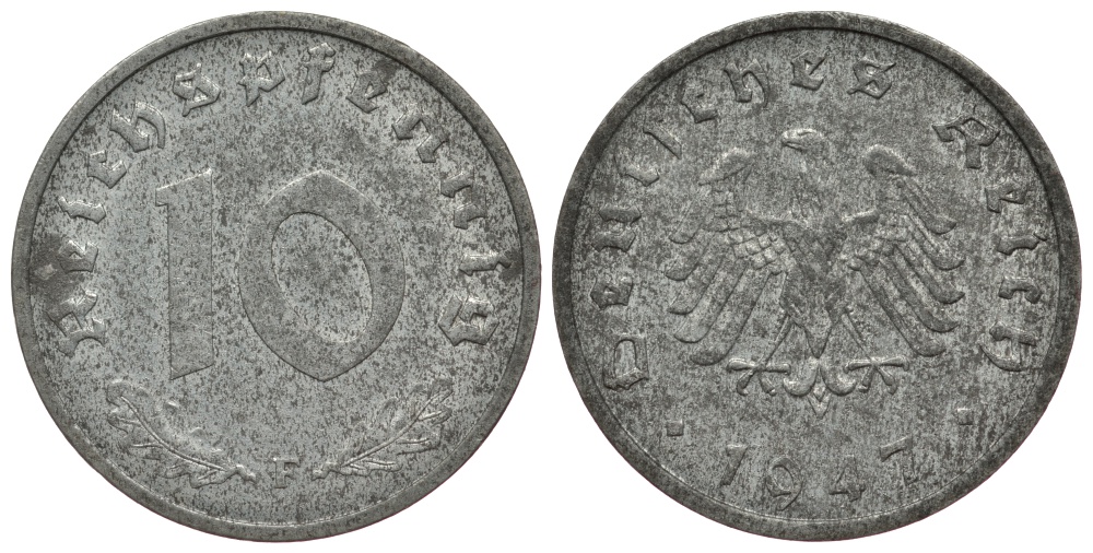 Германия 10 рейхспфеннигов 1947 F, оккупация Германии союзными войсками J. 375, KM A104 цинк 413-631