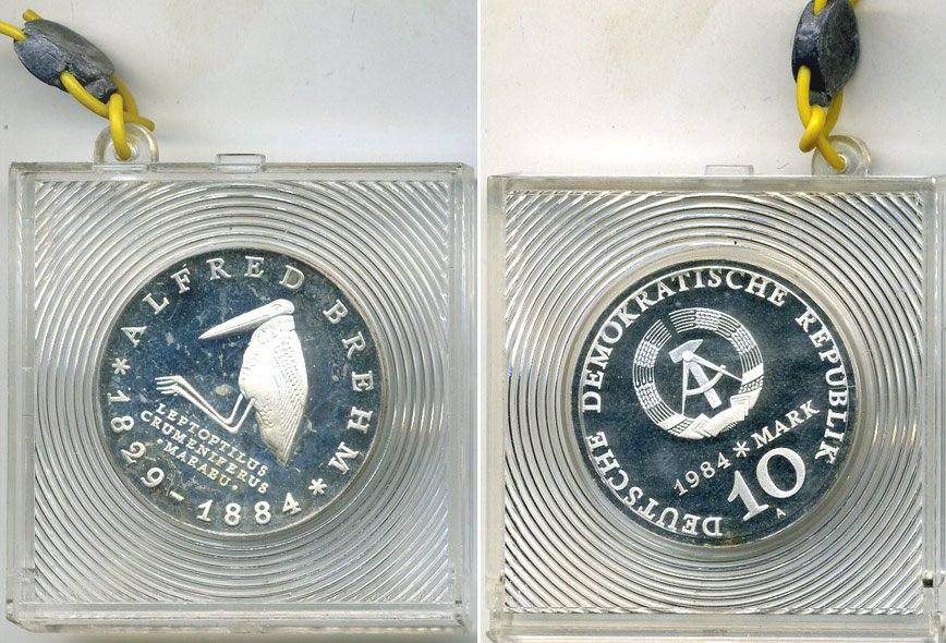 ГДР 10 марок 1984 A, 100 лет со дня смерти Альфреда Брема, тираж 5000 экз., в оригинальной упаковке, с пломбой KM 99 серебро PROOF 5-3-1-09