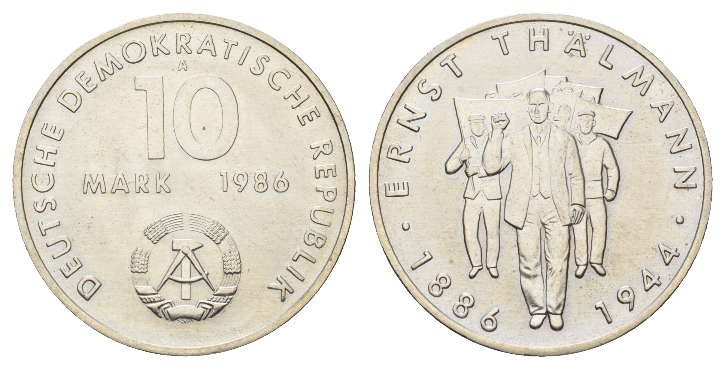 ГДР 10 марок 1986 А, 100 лет со дня рождения Эрнста Тельмана (1886-1944) KM 109, J. 1608 медно-никель UNC 4680-725
