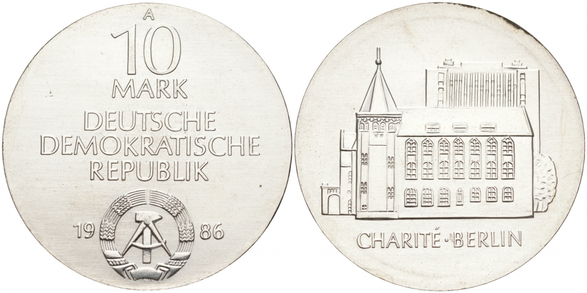 ГДР 10 марок 1986 А, 275 ЛЕТ ОСНОВАНИЯ КЛИНИКИ ШАРИТЕ В БЕРЛИНЕ KM 113 серебро UNC 00-000-00