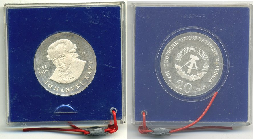 ГДР 20 марок 1974 А, 250 лет со дня смерти Иммануила Канта, тираж 4284 экземпляра, в оригинальной упаковке, пломба KM 53 серебро PROOF 06-128-11-1