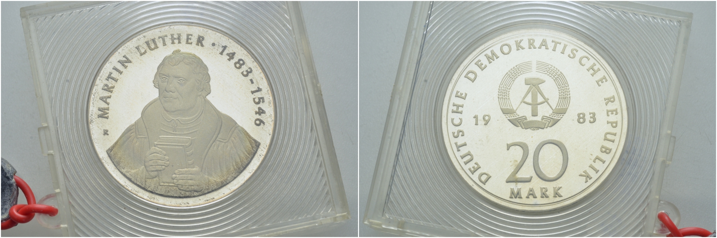 ГДР 20 марок 1983 A, 500 лет со дня рождения Мартина Лютера (1483-1546), в оригинальной коробке с пломбой J.1591, KM 94 серебро PROOF 10-005-81