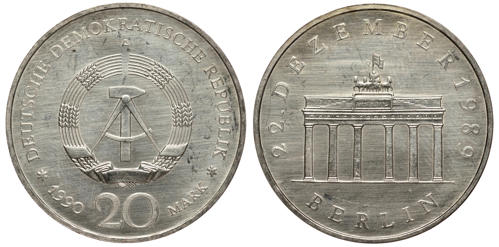 ГДР 20 марок 1990 A, открытие Бранденбургских ворот KM 139a серебро 413-2913