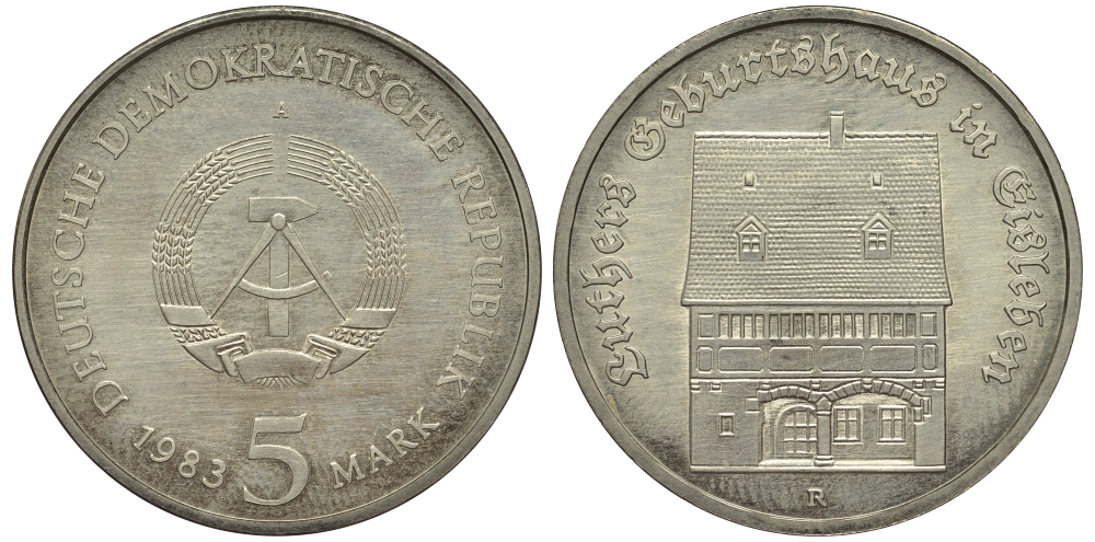 ---ГДР 5 марок 1983 А, Мартин Лютер, дом рождения в Айслебене KM 90, J. 1590 медно-никель UNC 413-6741НовинкиАнтичность и раннее СредневековьеМонеты - ГерманияМонеты - ЕвропаМонеты - Австралия и ОкеанияМонеты - АзияМонеты - АмерикаМонеты - АфрикаМонеты - Россия, СССР, страны СНГ и БалтииБанкнотыАксессуары, ЛитератураОткрытки, карточкиАкции, облигацииЖетоны, Медали, ЗнакиМаркиКартины, декоративно-прикладное искусство