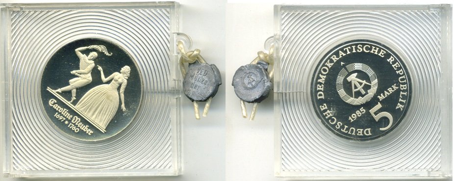 ГДР 5 МАРОК 1985 A, 225 ЛЕТ СМЕРТИ КАРОЛИНЫ НЕУБЕР, ТИРАЖ 4000 ЭКЗ., В ОРИГИНАЛЬНОЙ ПЛАСТИКОВОЙ УПАКОВКЕ, С ПЛОМБОЙ KM 104 медно-никель PROOF 5-3-62-16