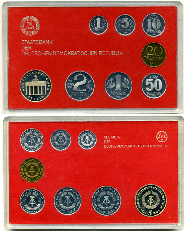 ГДР официальный набор из 8 монет включая 5 марок Бранденбургские ворота 1982 тираж 2500 экземпляров, твердый пластик KM PS 3 PROOF 4-3-5-23