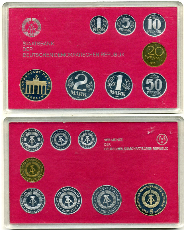 ГДР официальный набор из 8 монет включая 5 марок Бранденбургские ворота 1986 тираж 2800 экземпляров, твердый пластик KM PS 7 PROOF 4-3-5-27
