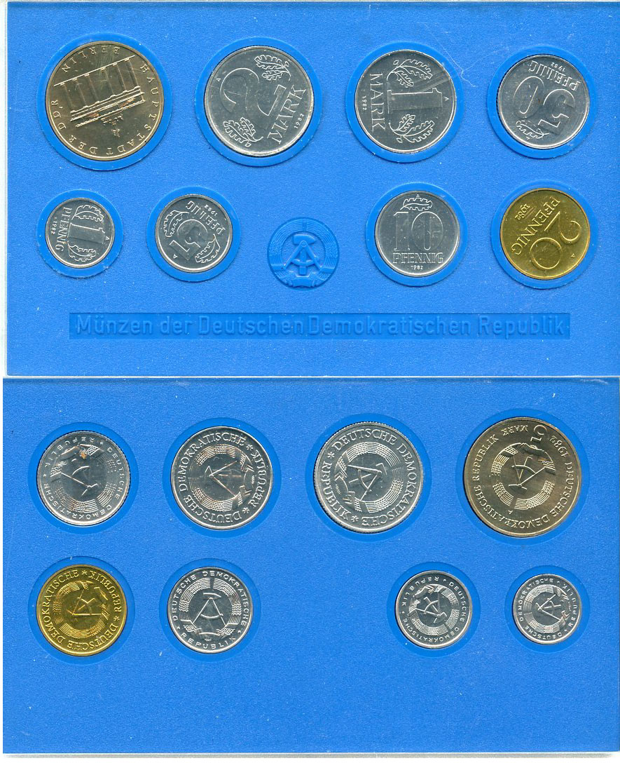 -----ГДР официальный набор из 8 монет включая 5 марок Бранденбургские ворота 1982 тираж 21000 экземпляров, твердый пластик KM MS4 UNC 8-2-04-09