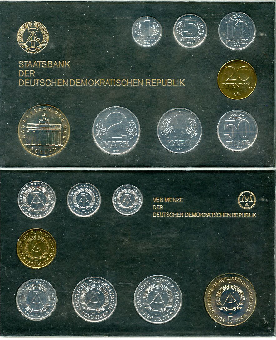 -----ГДР официальный набор из 8 монет включая 5 марок Бранденбургские ворота 1984 тираж 4500 экземпляров, твердый пластик KM MS9 UNC 8-2-04-10