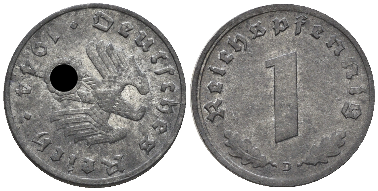 Германия 1 рейхспфенниг 1944 D, редкий брак, поворот аверса к реверсу на 50 градусов J. 369, KM 97 цинк aUNC 1524-121