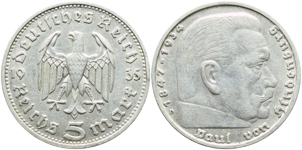 ГЕРМАНИЯ 5 РЕЙХСМАРОК 1935 D, ГИНДЕНБУРГ КМ 86 J.360 серебро 4389-1343