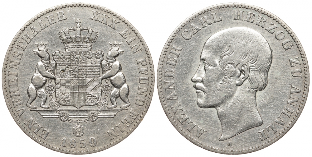 Ангальт 1 талер 1859 A, Александр Карл Герцог Ангальт KM 86 серебро 00-000-00