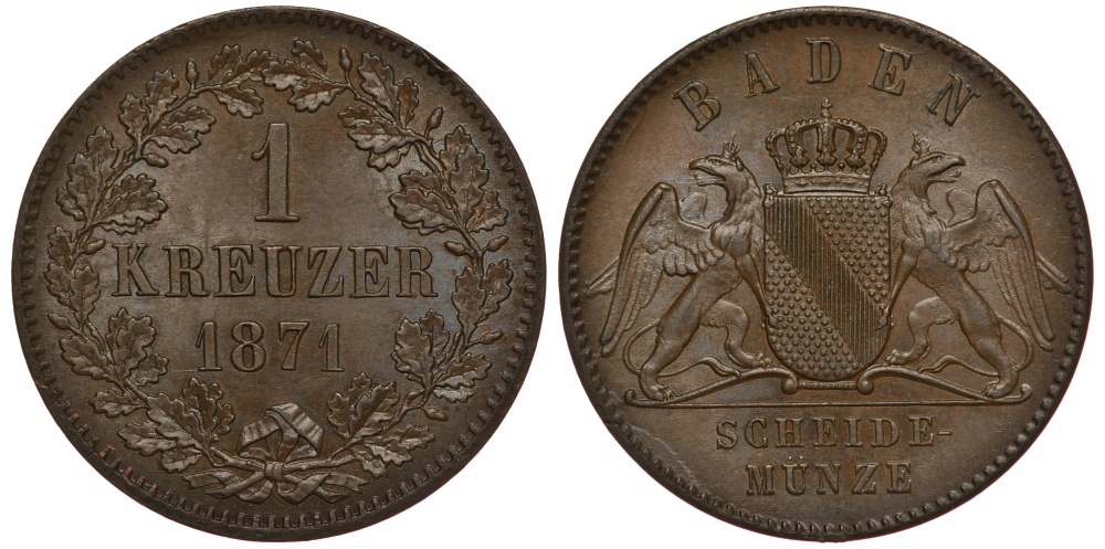 Баден 1 крейцер 1871 Великий Герцог Фридрих I (1856-1907) KM 242, Jaeger 81, AKS 132. 21,5 mm медь 441-722