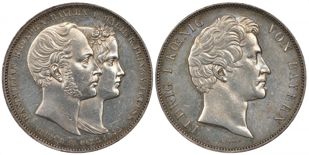 Бавария 2 талера 1842 Людвиг I, свадебный, свадьба Баварского Кронпринца Максимилиана и Марии Прусской AKS 104 b, Dav. 588, Kahnt 108 b, Thun 81 серебро 00-000-00