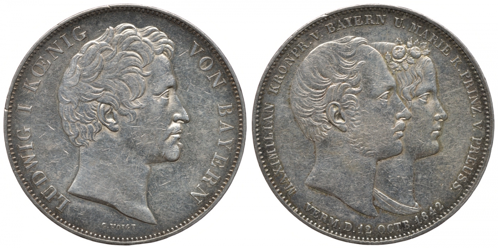 Бавария 2 талера 1842 Людвиг I, свадебный, свадьба Баварского Кронпринца Максимилиана и Марии Прусской AKS 104 b, Dav. 588, Kahnt 108 b, Thun 81 серебро 00-806-67