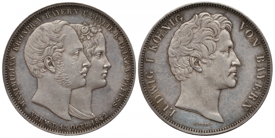 Бавария 2 талера 1842 Людвиг I, свадебный, свадьба Баварского Кронпринца Максимилиана и Марии Прусской AKS 104 b, Dav. 588, Kahnt 108 b, Thun 81 серебро 00-815-02