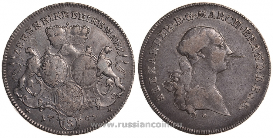 Бранденбург-Ансбах 1 талер 1767 G/S-KK, Карл Александр (маркграф Бранденбург-Ансбаха) KM 280, Dav. 1998 серебро 00-814-53