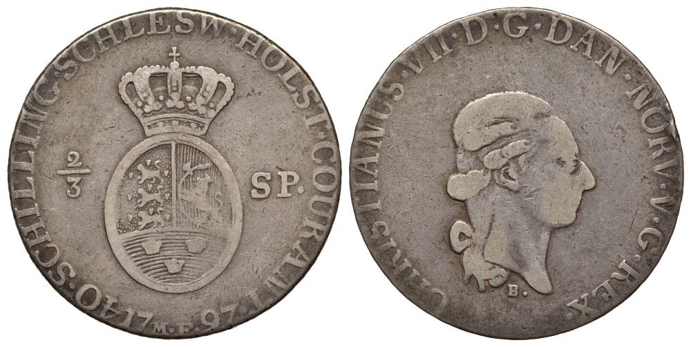 Шлезвиг-Гольштейн 40 шиллингов - 2/3 далера 1797 MF, Кристиан VII KM 8, Hede 40 A, Jaeger 9 серебро 00-811-49