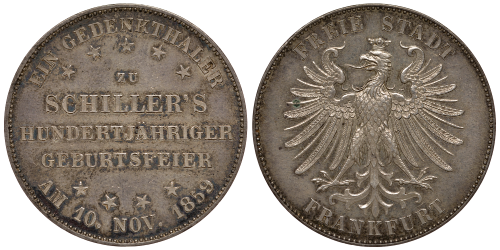 Франкфурт 1 талер 1859 100 лет со дня рождения Фридриха Шиллера AKS 43; Dav. 650; Kahnt 167; Thun 139, KM 359 серебро UNC 00-814-26