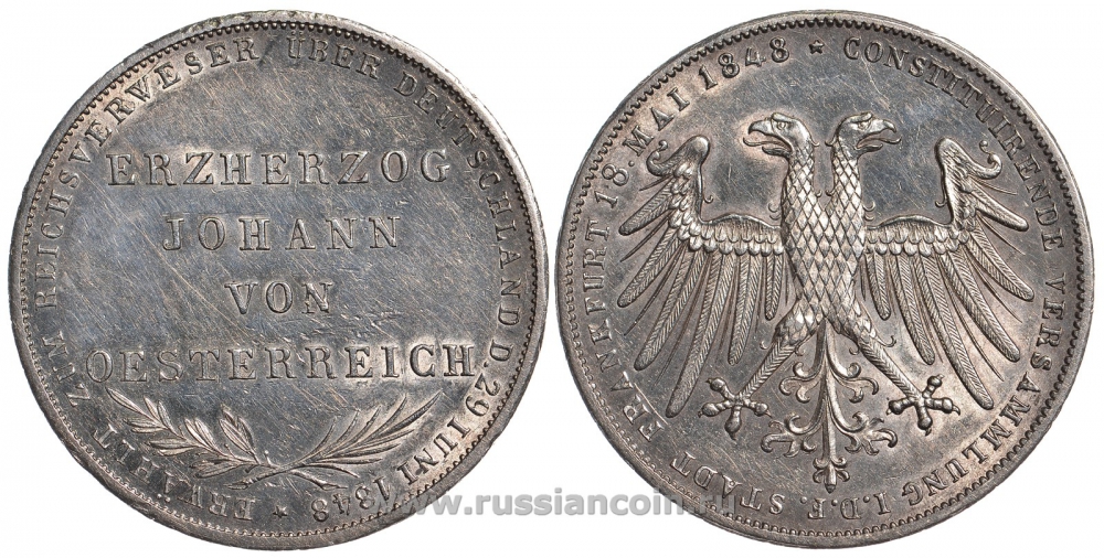 Франкфурт 2 гульдена 1848 эрцгерцог Иоганн Австрийский Dav. 644, Thun 135, KM 338, AKS 39 серебро 00-804-26