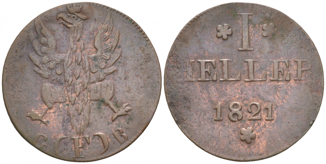 Франкфурт 1 геллер 1821 GB AKS 30, Jaeger 10, KM 301 медь 73-627