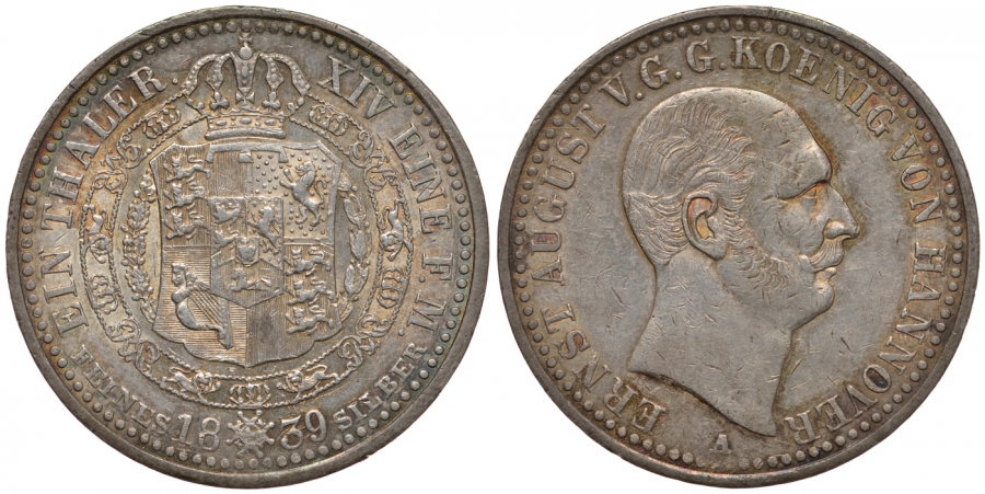 Брауншвейг-Каленберг-Ганновер 1 талер 1839 A, Эрнст Август (1837-1851) КМ 182, Jaeger 64, Thun 157, AKS. 100, Kahnt 225 серебро 00-816-39