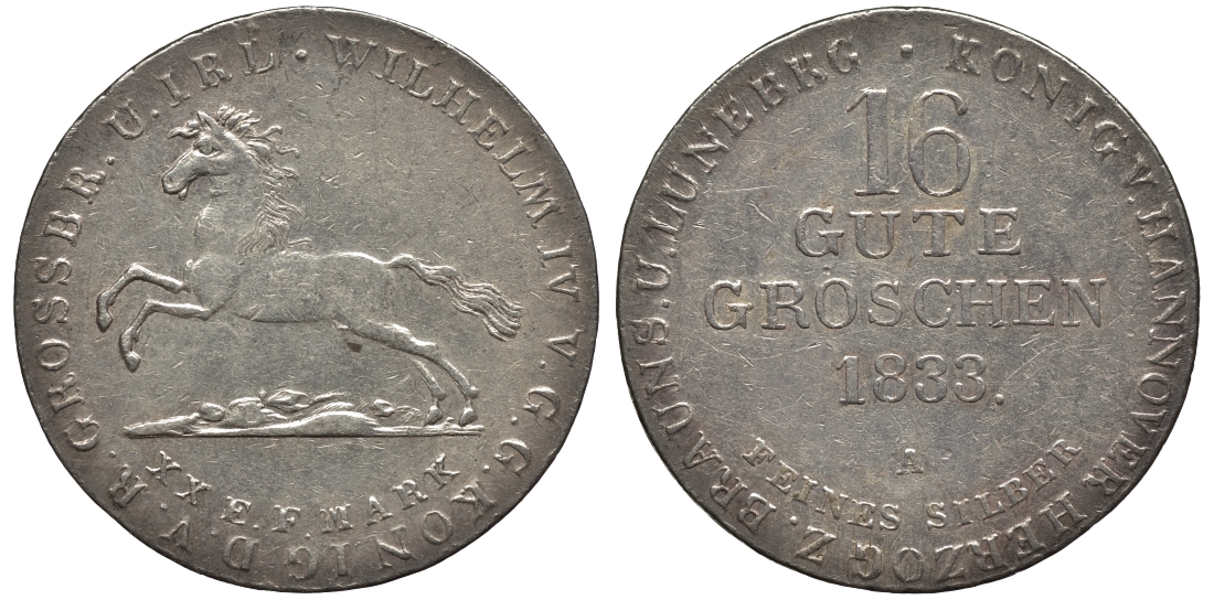 Ганновер 16 гутергрошенов 1833 A, Вильгельм IV (1830-1837) J. 33, AKS 66, Kahnt 212 серебро aUNC 11-119-54
