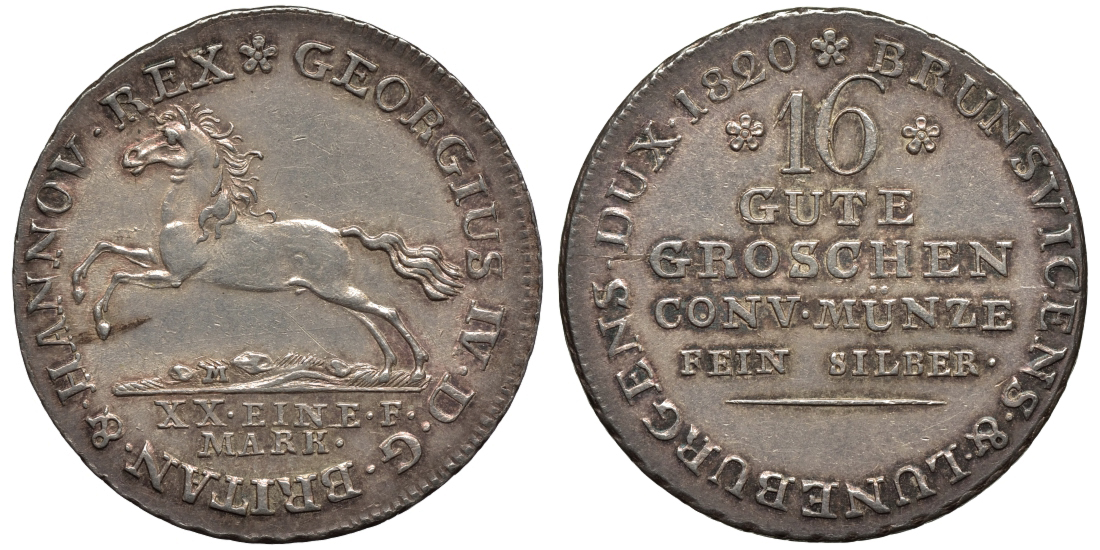 Брауншвейг-Каленберг-Ганновер 16 гутергрошенов 1820 король Георг IV (1820-1830) J 23 b, AKS 33 серебро aUNC 11-119-24