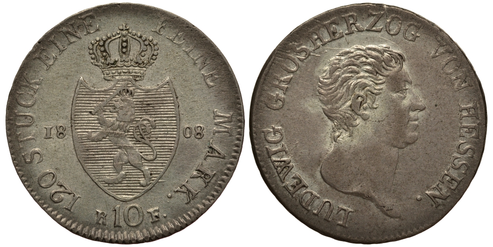 Гессен-Дармштадт 10 крейцеров 1808 RF, Великий Герцог Людвиг I (1806-1830) KM 271 серебро 00-000-00