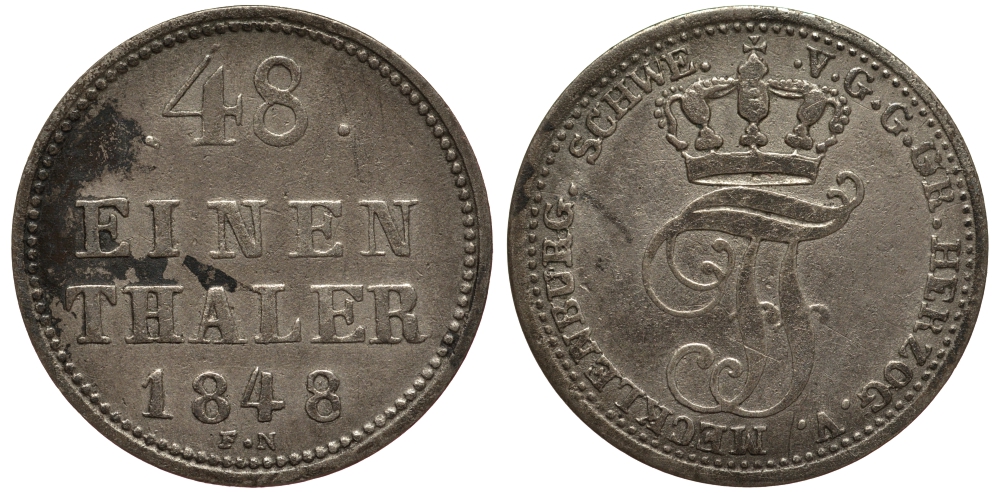 -Мекленбург-Шверин 1/48 талера 1848 F.N., Фридрих Франц II (1842-1883) AKS 43, Jaeger 52, KM 301 (C107) серебро 1517-542Другие землиАнгальт - AnhaltСаксен-Кобург-Гота - Sachsen-Coburg-GothaЮлих-Берг - JulichbergЭйхштадт - EichstattШтольберг - StolbergШпеер - SpeyerШварцбург - SchwarzburgШамбург - SchaumburgФранкфурт - FrankfurtСоест - SoestСилезия - SchlesienСаксония - SachsenБерг - BergПадерборн - PaderbornШаумбург - SchaumburgИзенбург - IsenburgПомерания - PommernМайнц - MainzОснабрюк - OsnabruckЭмден - EmdenЭрфурт - ErfurtАхен - AachenВисмар - WismarВид - WiedРейс - ReussГослар - GoslarГанновер - HannoverАугсбург - AugsburgБавария - BayernБаден - BadenБамберг - BambergБранденбург - BrandenburgБрауншвейг - BraunschweigБремен - BremenВальдек - WaldeckВестфалия - WestfalenВормс - WormsВюртемберг - WurttembergВюрцбург - WurzburgГамбург - HamburgРосток - RostockГессен - HessenЙевер - JeverЛевенштайн - LwensteinЛиппе - LippeЛюбек - LubeckМансфельд - MansfeldМюнстер - MunsterНассау - NassauНюрнберг - NurnbergОльденбург - OldenburgПруссия - PreussenПфальц - PfalzРегенсбург - Regensburg