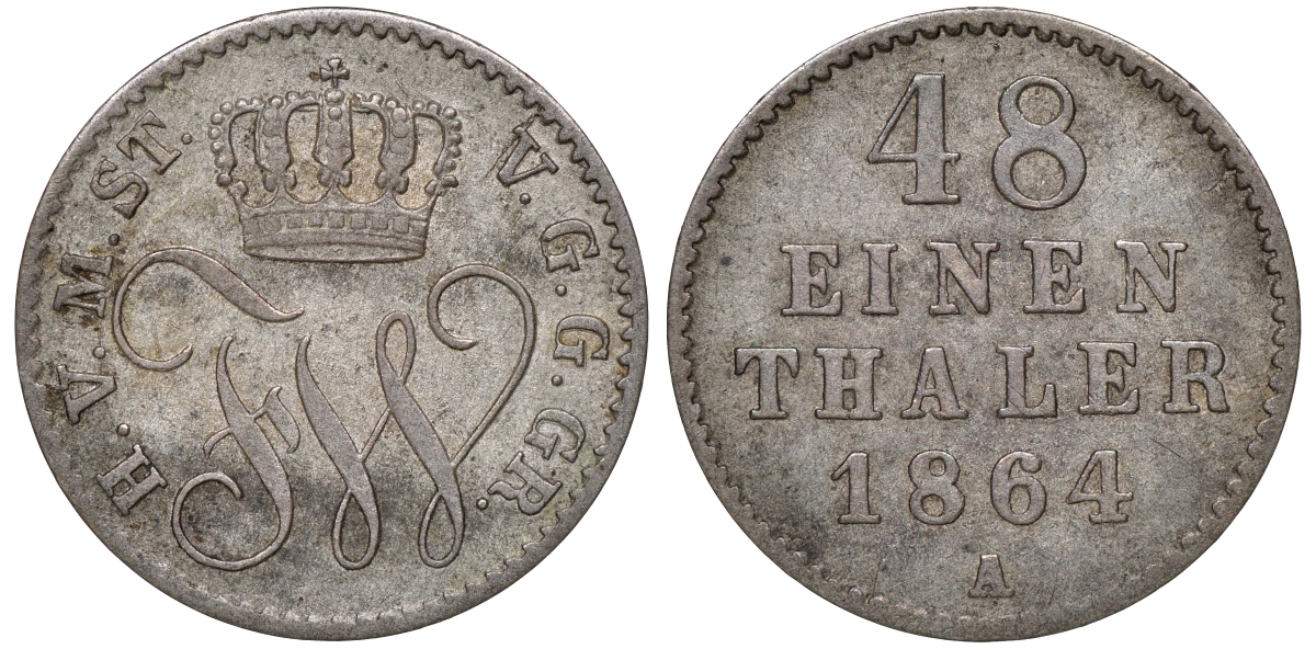 Мекленбург-Стрелиц 1/48 талера 1864 A, Фридрих Франц II (1842-1883) KM 96 серебро 4516-718