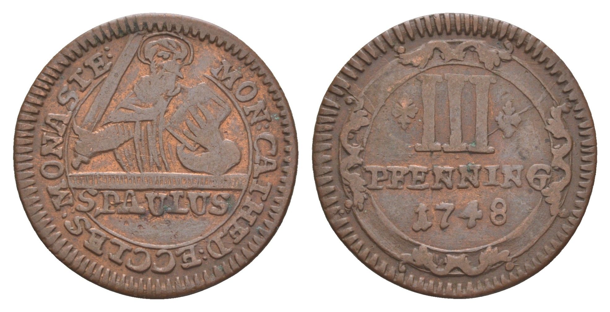 Мюнстер 3 пфеннига 1748 Монетный двор кафедрального капитула KM 430 медь 633-1443