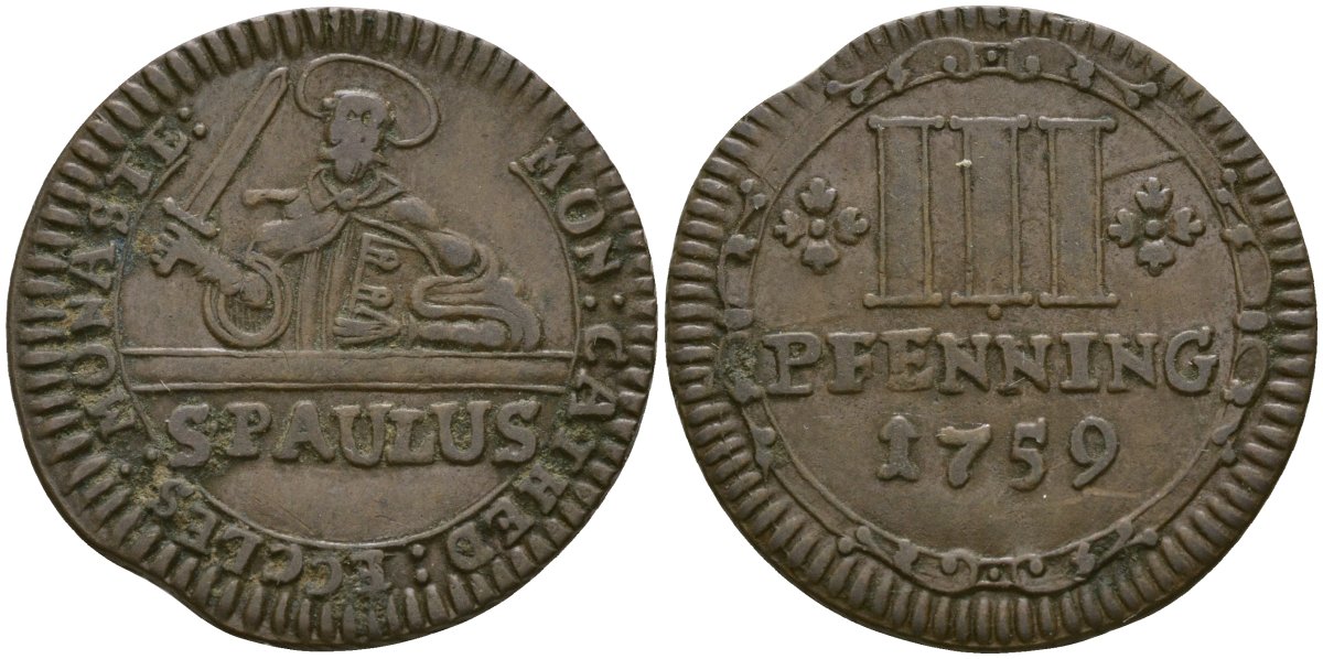 -Мюнстер 3 пфеннига 1759 KM 430 медь 272-241Другие землиАнгальт - AnhaltСаксен-Кобург-Гота - Sachsen-Coburg-GothaЮлих-Берг - JulichbergЭйхштадт - EichstattШтольберг - StolbergШпеер - SpeyerШварцбург - SchwarzburgШамбург - SchaumburgФранкфурт - FrankfurtСоест - SoestСилезия - SchlesienСаксония - SachsenБерг - BergПадерборн - PaderbornШаумбург - SchaumburgИзенбург - IsenburgПомерания - PommernМайнц - MainzОснабрюк - OsnabruckЭмден - EmdenЭрфурт - ErfurtАхен - AachenВисмар - WismarВид - WiedМекленбург - MecklenburgРейс - ReussГослар - GoslarГанновер - HannoverАугсбург - AugsburgБавария - BayernБаден - BadenБамберг - BambergБранденбург - BrandenburgБрауншвейг - BraunschweigБремен - BremenВальдек - WaldeckВестфалия - WestfalenВормс - WormsВюртемберг - WurttembergВюрцбург - WurzburgГамбург - HamburgРосток - RostockГессен - HessenЙевер - JeverЛевенштайн - LwensteinЛиппе - LippeЛюбек - LubeckМансфельд - MansfeldНассау - NassauНюрнберг - NurnbergОльденбург - OldenburgПруссия - PreussenПфальц - PfalzРегенсбург - Regensburg