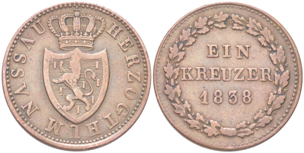 Нассау 1 крейцер 1838 KM 51 медь 4613-526